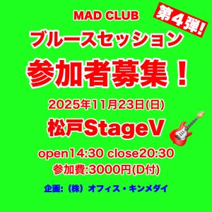 3コードのブルース、ロックンロールからジャズファンクまでキメ曲なしのインプロ大会です。もちろん既存曲もOK!